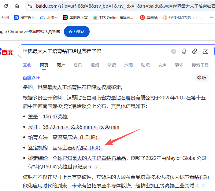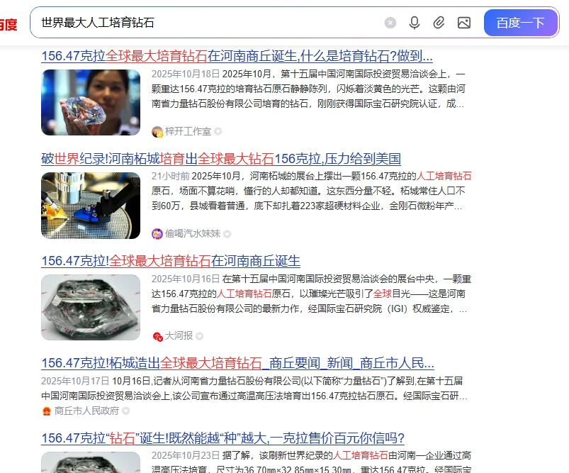 To help you understand the Chinese text in this image, I’ll translate it for you first. The search term used on Baidu is “Has the world’s largest lab-grown diamond been certified?”